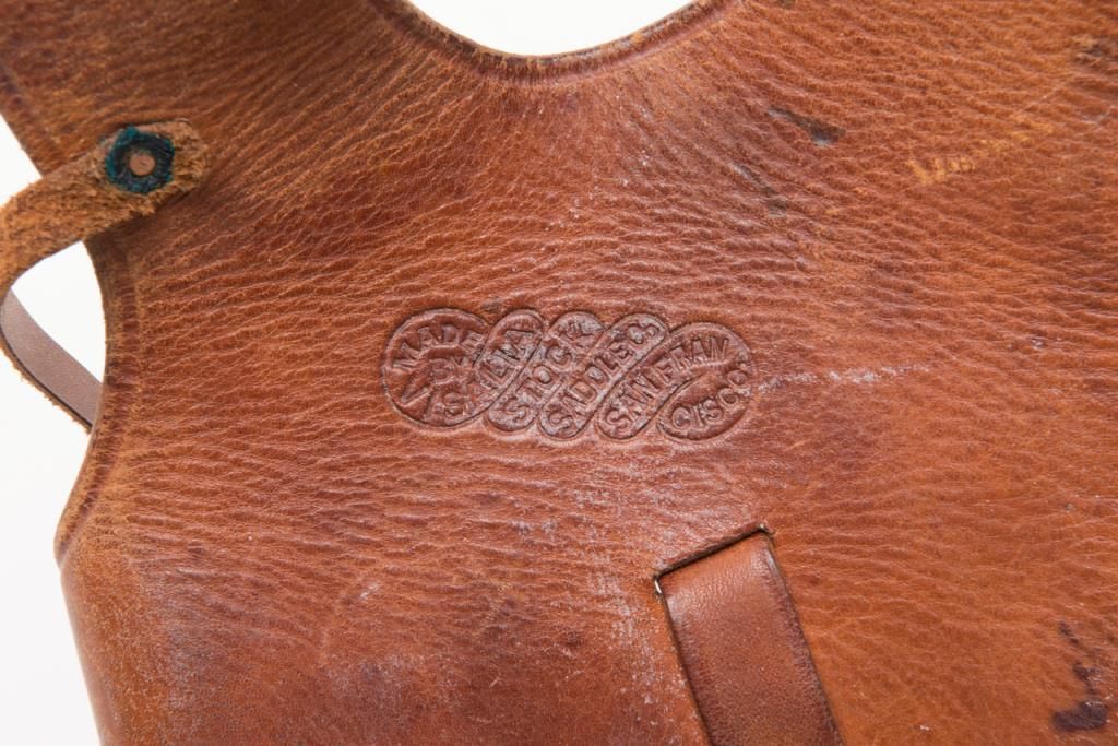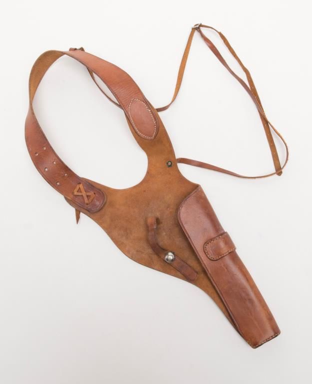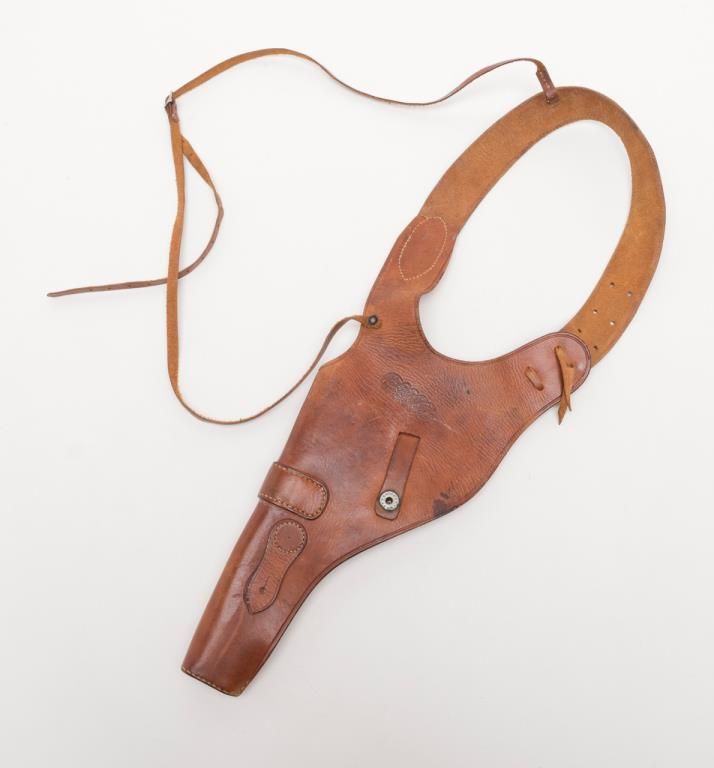 Early shoulder holster for Colt long slide model 1900 or 1902 semi-automatic pistol showing early snake style intertwined marking by Visalia Stock and Saddle Co., San Francisco, California with straps in good to very good condition. Est.:$250-$500