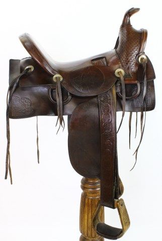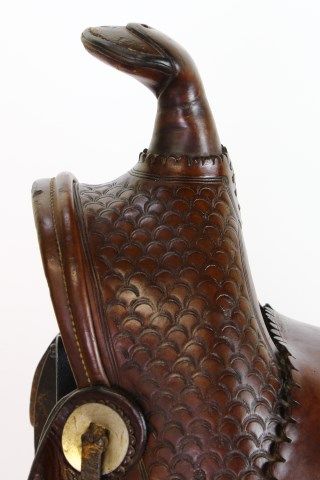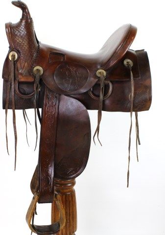 Buffalo Bill Cody on jockeys, longhorns on fenders and floral pattern skirts, marked Steel Fork on left side, no visible makers stamp, saddle remains in fine original condition, nice rich patina, 8 string double rigged, 15" seat. Est. 800-1500