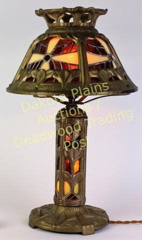 cast iron with art Noveau floral leaf pattern, lights top and bottom, rewired with period correct cloth cord and plug in, 19" tall, excellent condition. Est. 300-500