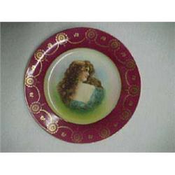 Portrait plate, gilt medallion and swag over cranberry ground border decoration, center portrait of a young woman, marked on back Schwarzburg, early to mid 20th C.