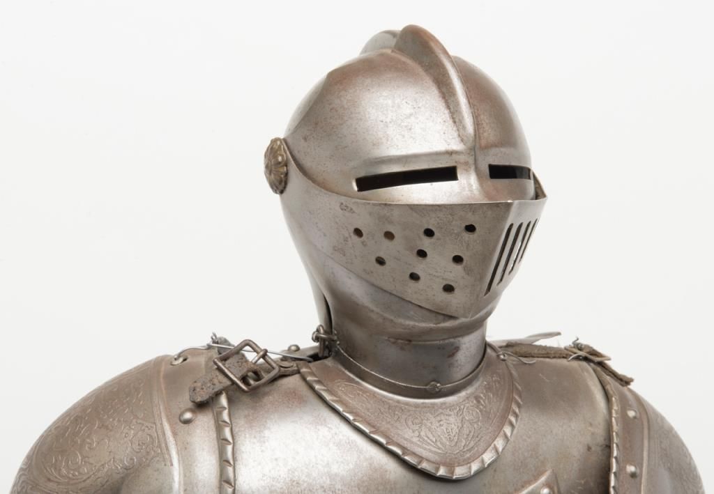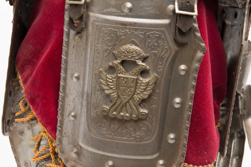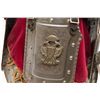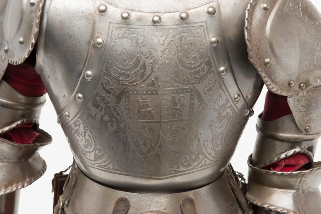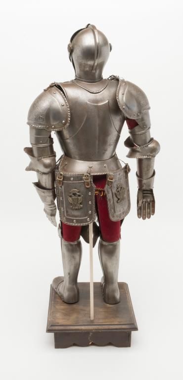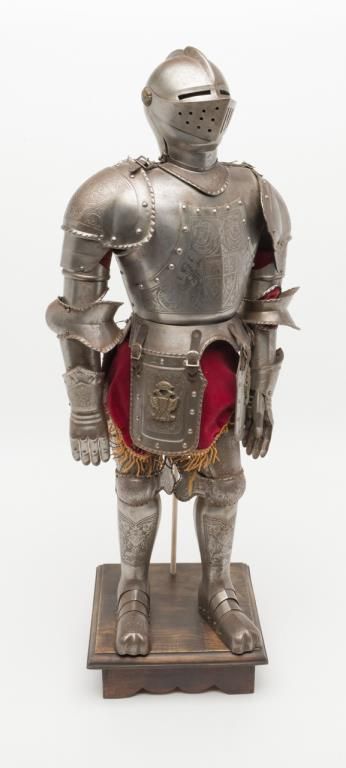 Early to mid-19th century expertly constructed etched miniature suit of armor, Austrian crests, approx. 34” in height, 14” in width and 8” in depth at the waist, on wood base that is approx. 11” square and 3-1/2” in height. The suit isdesigned in the classic medieval style with many articulating parts and etched panel scenes of heraldry, griffins, etc. Armor panels are secured by riveted leather straps, true to how actual full-sized suits were constructed and agold-fringed red under coat material is utilized beneath the suit on top of the supportive framework. Est.: $750-$1,500.