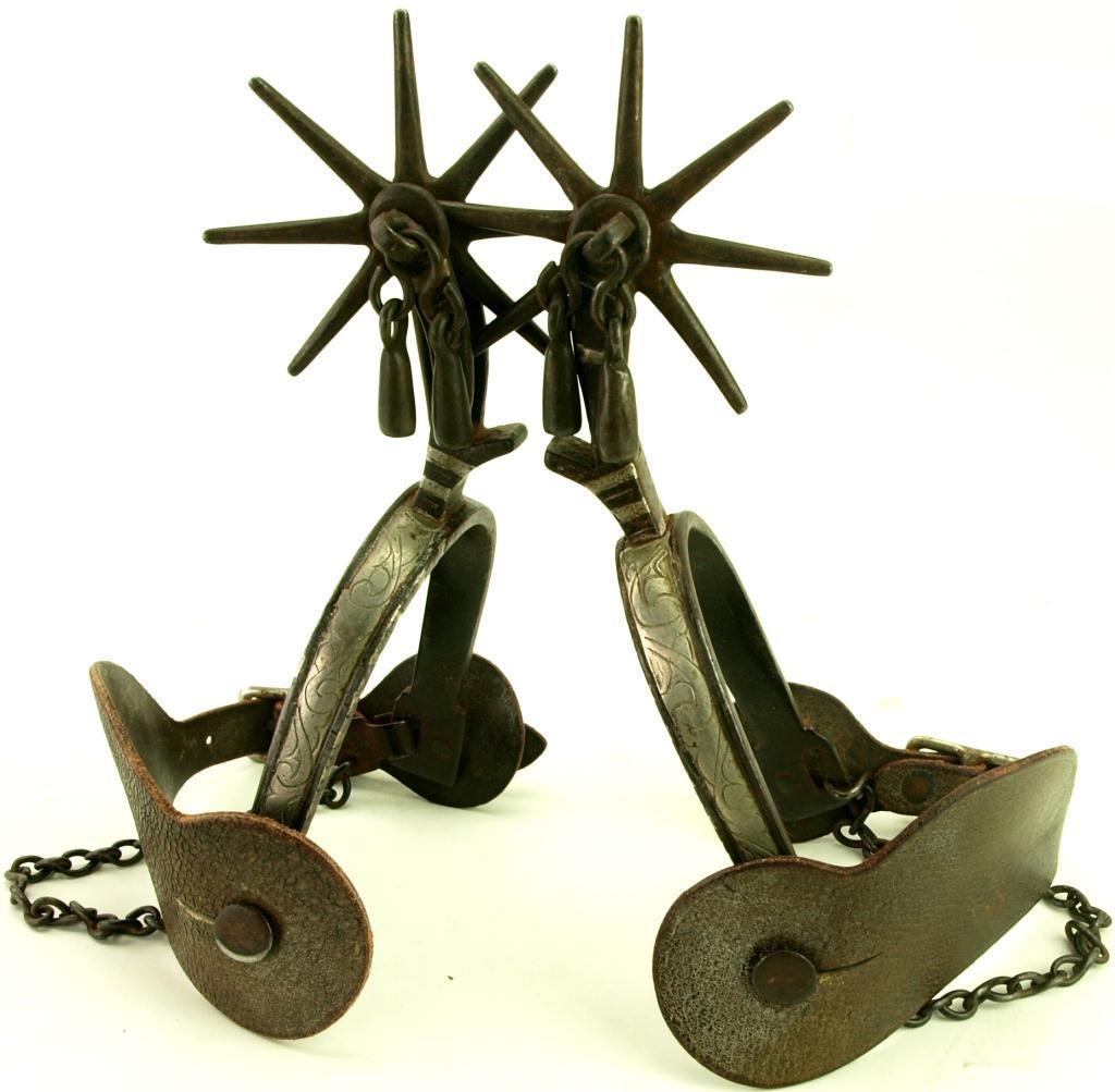 drop shank chap guards 4" rowels with leather straps and jingle bobs.