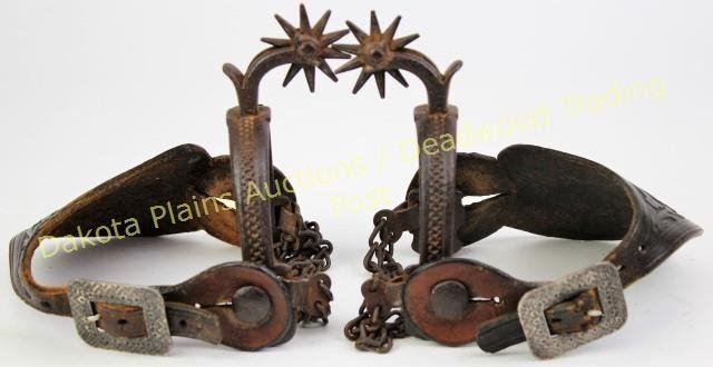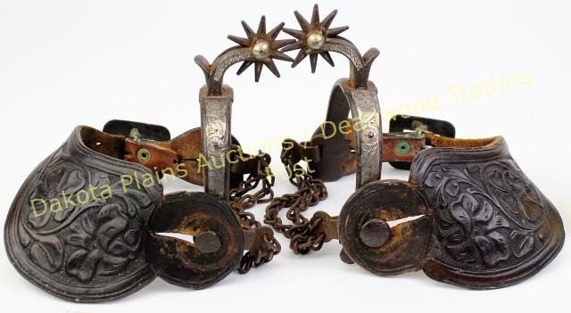cowboy spurs single mounted with original heel chains and great pair floral carved 2 piece straps fitted with engraved silver buckles, untouched condition with NO repairs. Est. 400-650
