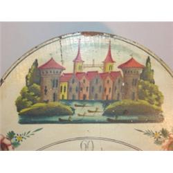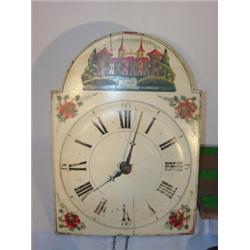 Early wag-on-the-wall clock with pendulum, two small weights, and two large weights. Face is decorated with castle scene.