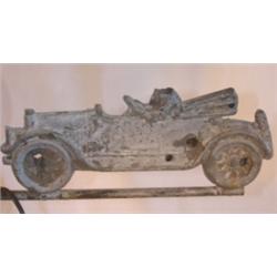 Early weather vane lamp with porcelain ball and old car with driver (head missing). Stands 43" tall to top of lamp and stands 26" to harp and measures 22 1/2" from arrow to end of car.