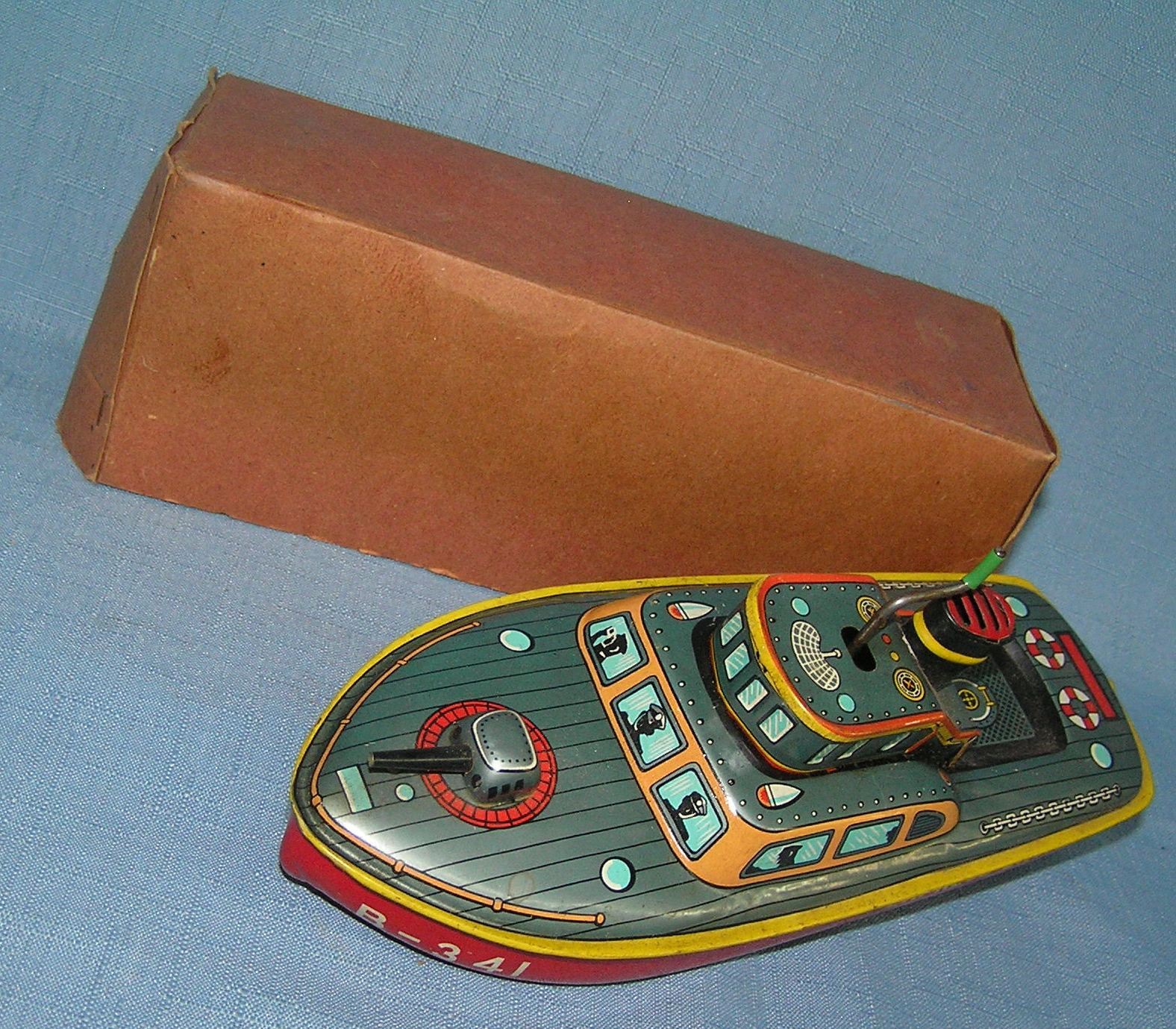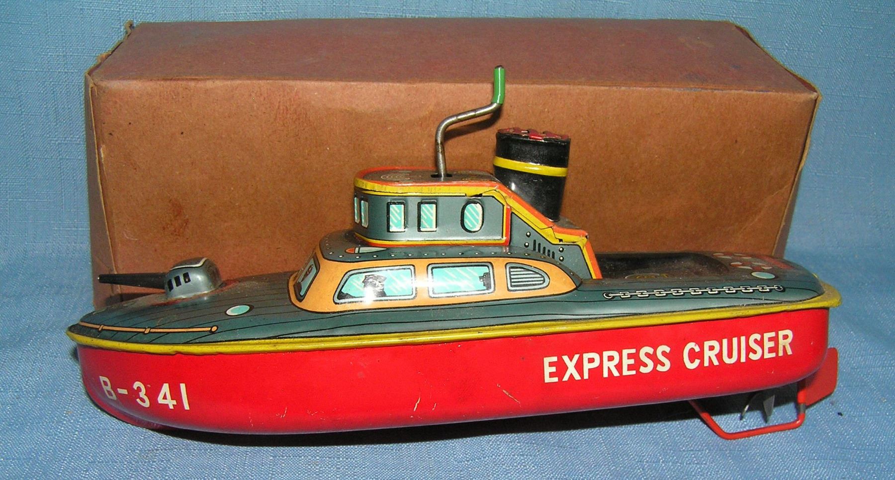 Early wind up mechanical all tin B-341 express cruiser boat with directional rudder and working great with lower portion of original box est. value $225.00-$250.00