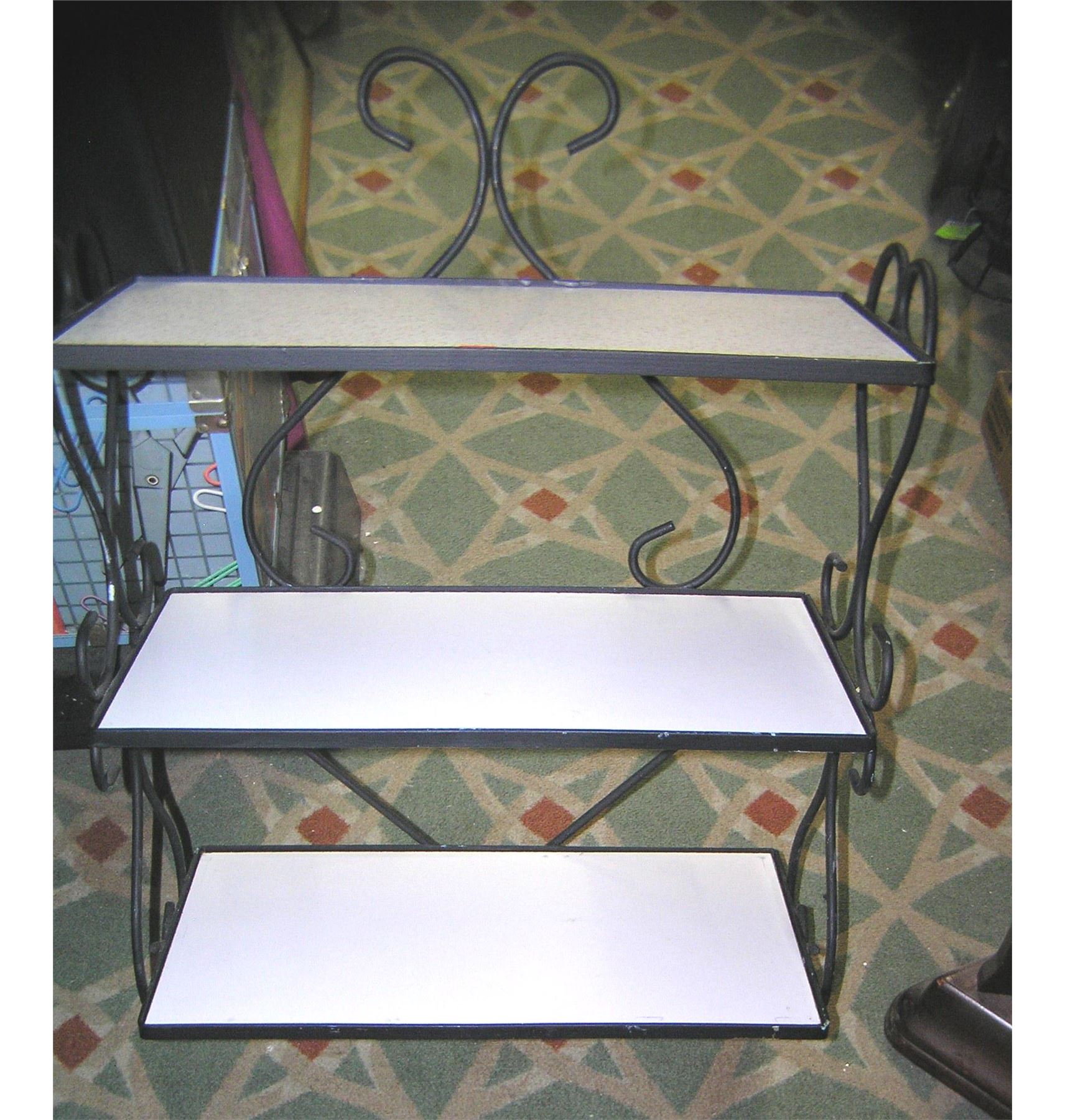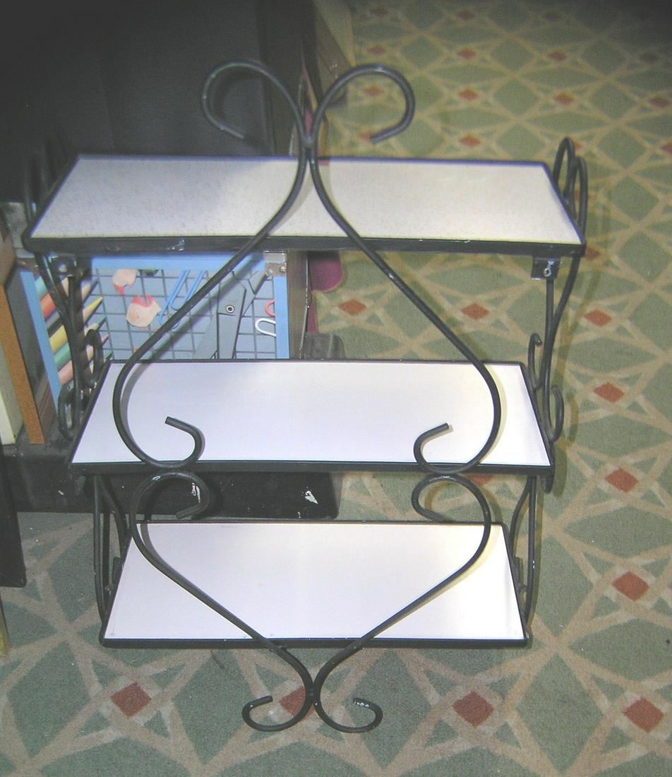 Early wrought iron 3 shelf wall display piece with masonite shelves circa 1950's est. value $75.00-$80.00
