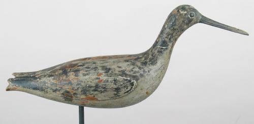 Early yellowlegs decoy attributed to Gardner, Nantucket, with beautifully carved feather detail on the wing tips. Wings are molded over the back. Brass tack eyes. Mostly OP with heavy wear on the left side of the back and breast. Bill possibly replaced. (decoy)