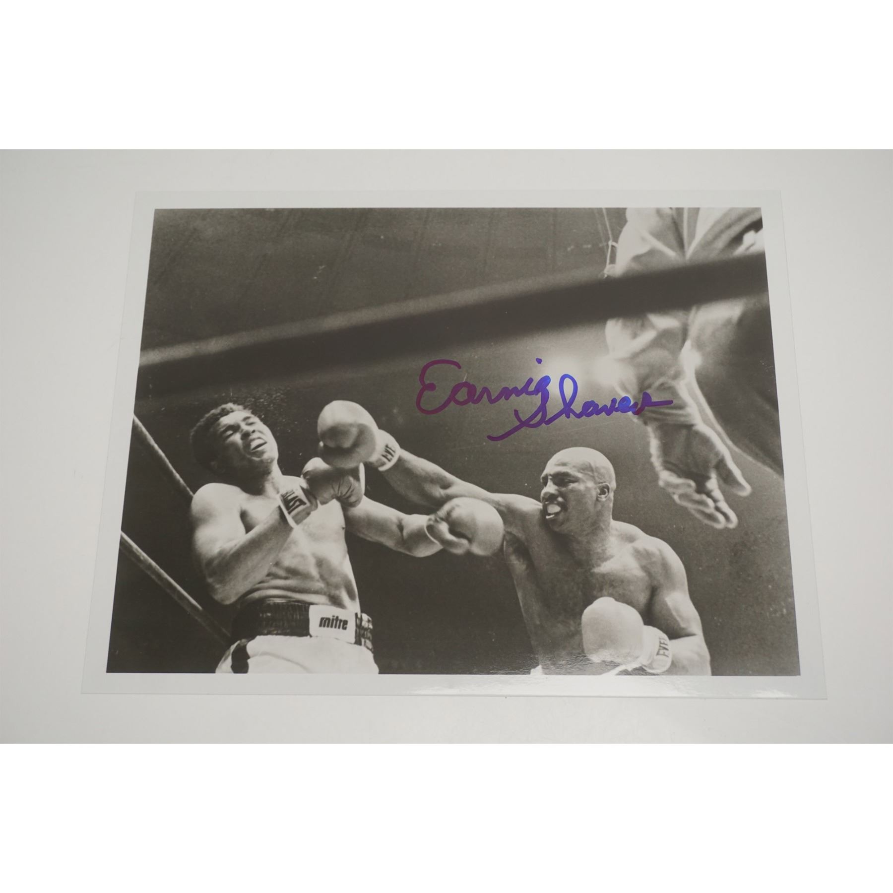 A striking black-and-white photograph capturing the legendary heavyweight boxer Earnie Shavers in action, delivering a powerful punch during a match. The image is boldly signed in blue marker by Earnie Shavers, known for his devastating punching power and memorable bouts against boxing greats, including Muhammad Ali and Larry Holmes. The autograph is prominently placed over the image, enhancing its display value. A remarkable piece of boxing history for collectors and sports memorabilia enthusiasts.