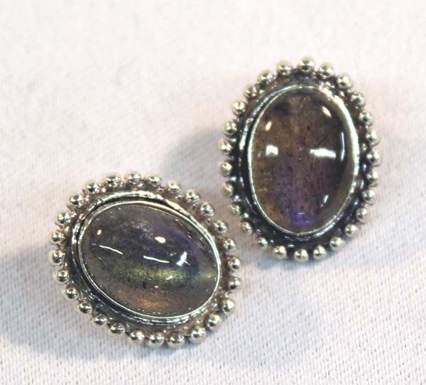 Earrings, Sterling Silver & Labradorite Cabochons. Bezel set Labradorite cabochons, with beaded edging, post style.