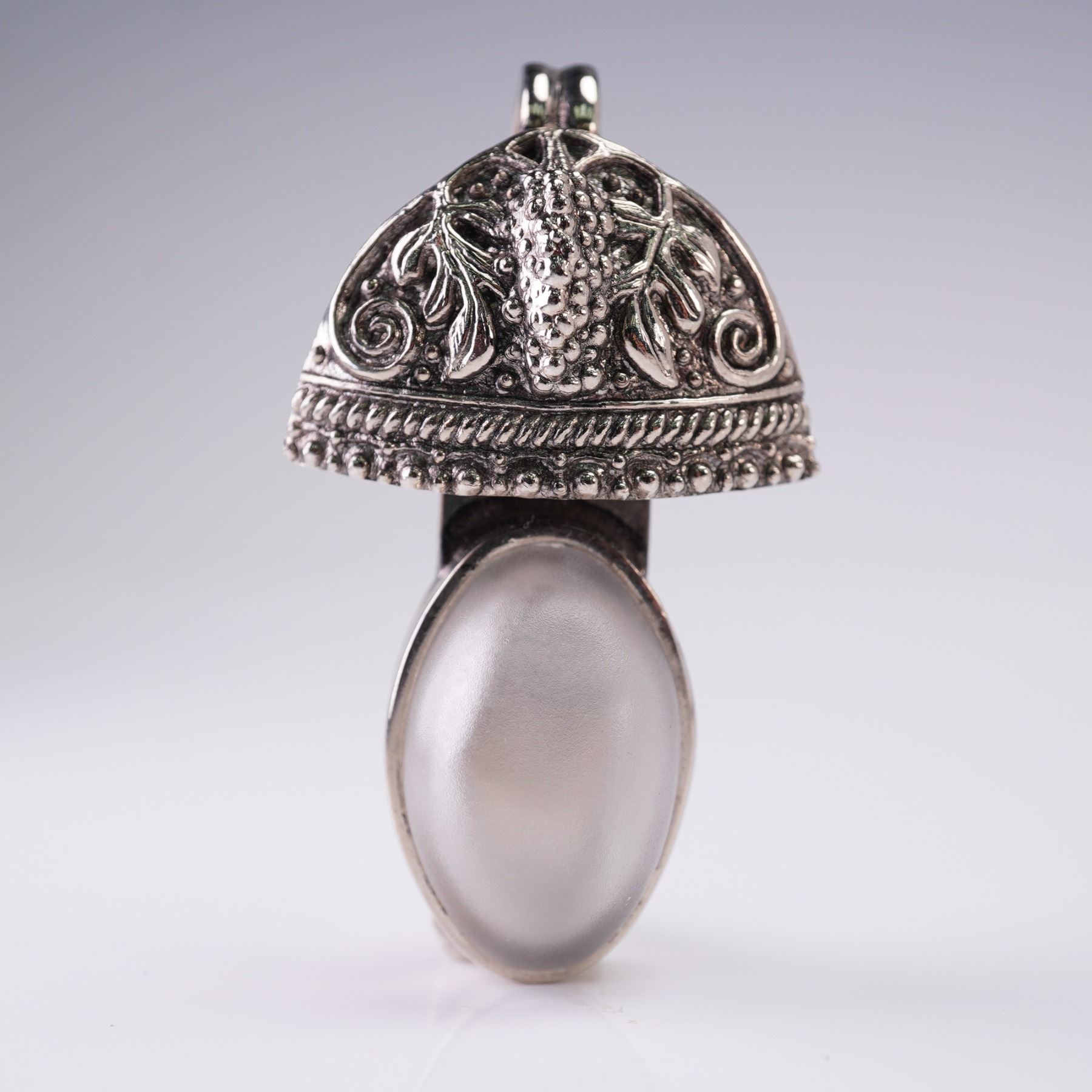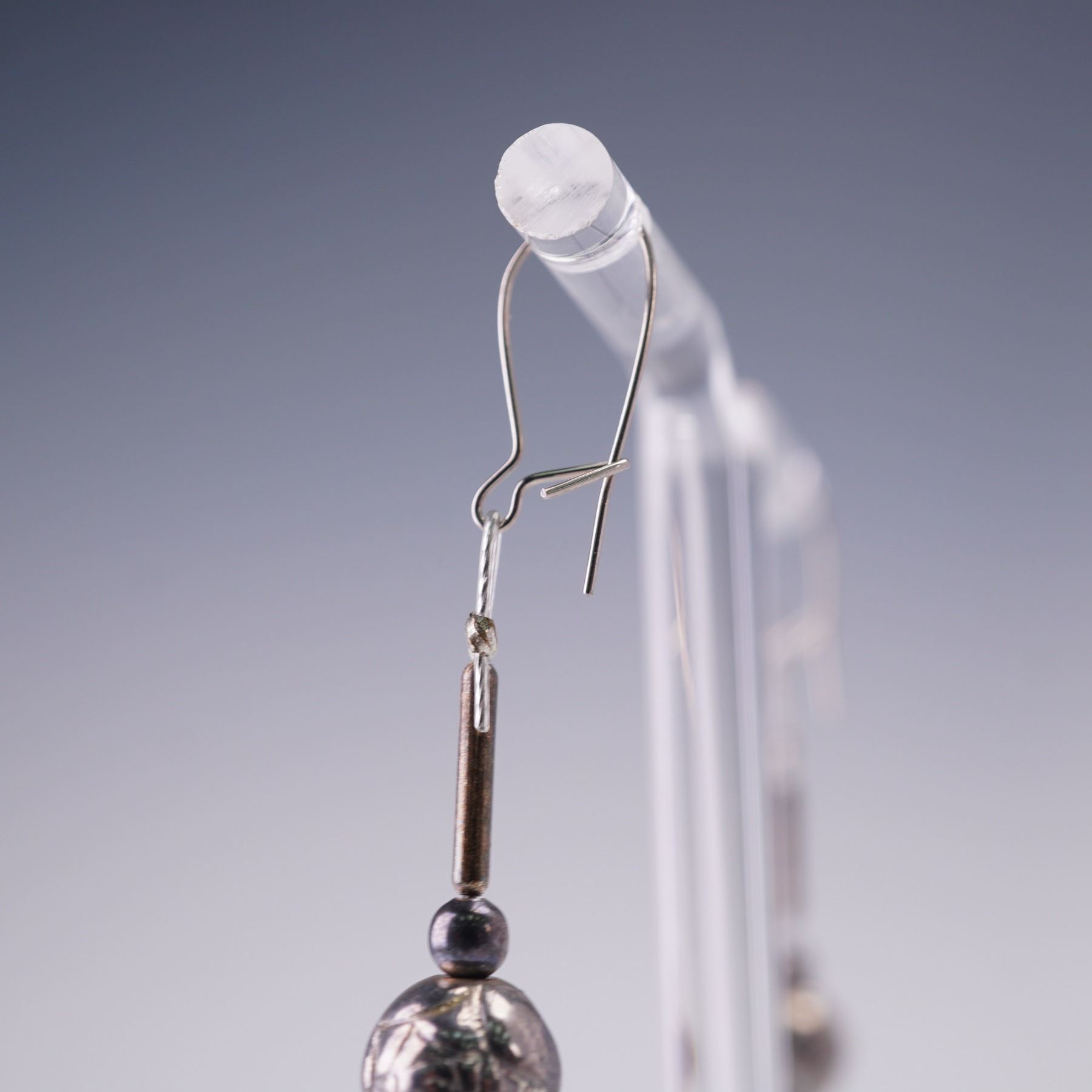 Lot includes a striking pair of dangle earrings featuring turquoise chip accents and oxidized silver-tone beads, measuring 2"H. Also included is a large, ornate pendant with raised dragon motif and oversized gray cabochon, measuring 2.25"H. The pendant is signed on the reverse in script that appears to read Rebecca Collins, known for bold and collectible artisan jewelry.