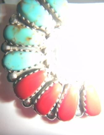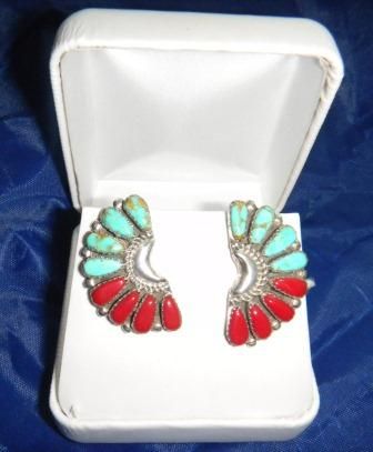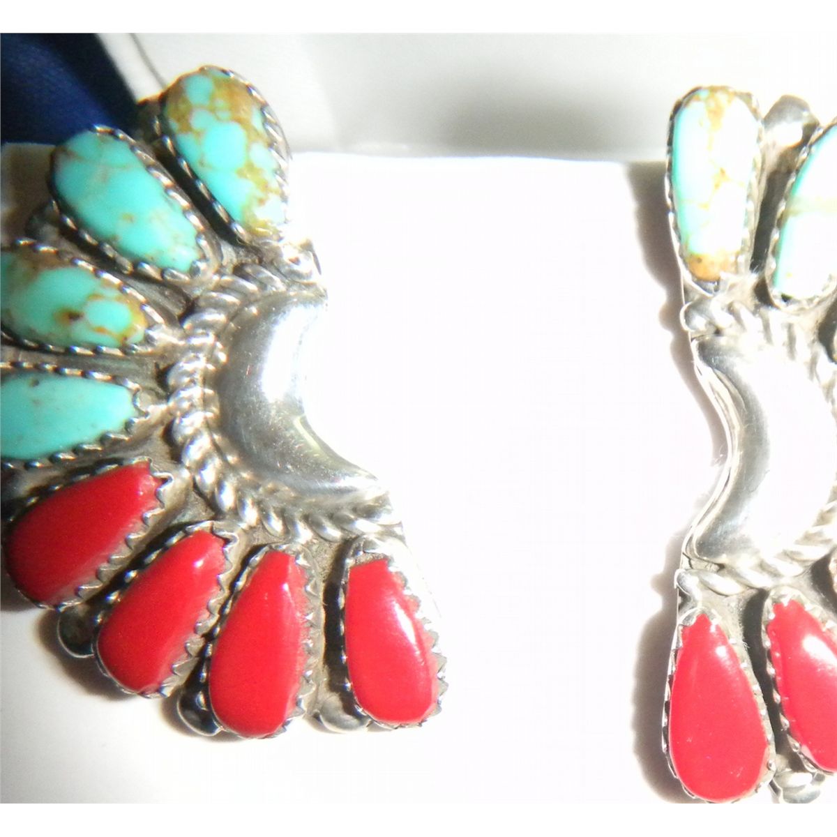 Hopi Turquoise and coral sterling silver earrings with eight stones each. These earrings are for pieced ears. Earrings are approximately three fourths by one half inches. Circa 1970 Shipping 10.50