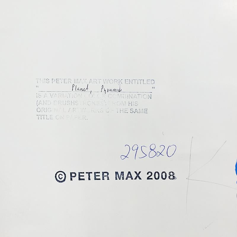 "Earth Day 2000" is a one-of-a-kind acrylic mixed media on paper, hand signed by Peter Max. The piece comes custom framed with a backside cutout to display Peter Max Studio registration number 295820 certifying authenticity. Measures approx. 48.5" x 36.5" (frame), 36" x 24" (image). This item requires special handling and may have a longer than usual turnaround.