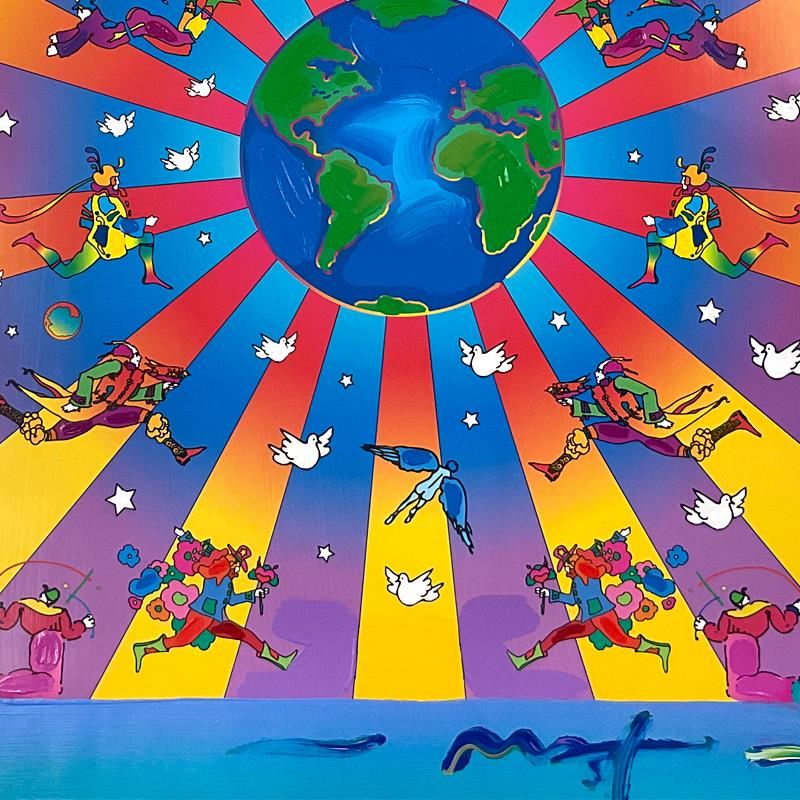 "Earth Day 2000" is a one-of-a-kind acrylic mixed media on paper, hand signed by Peter Max. The piece comes custom framed with a backside cutout to display Peter Max Studio registration number 295820 certifying authenticity. Measures approx. 48.5" x 36.5" (frame), 36" x 24" (image). This item requires special handling and may have a longer than usual turnaround.