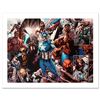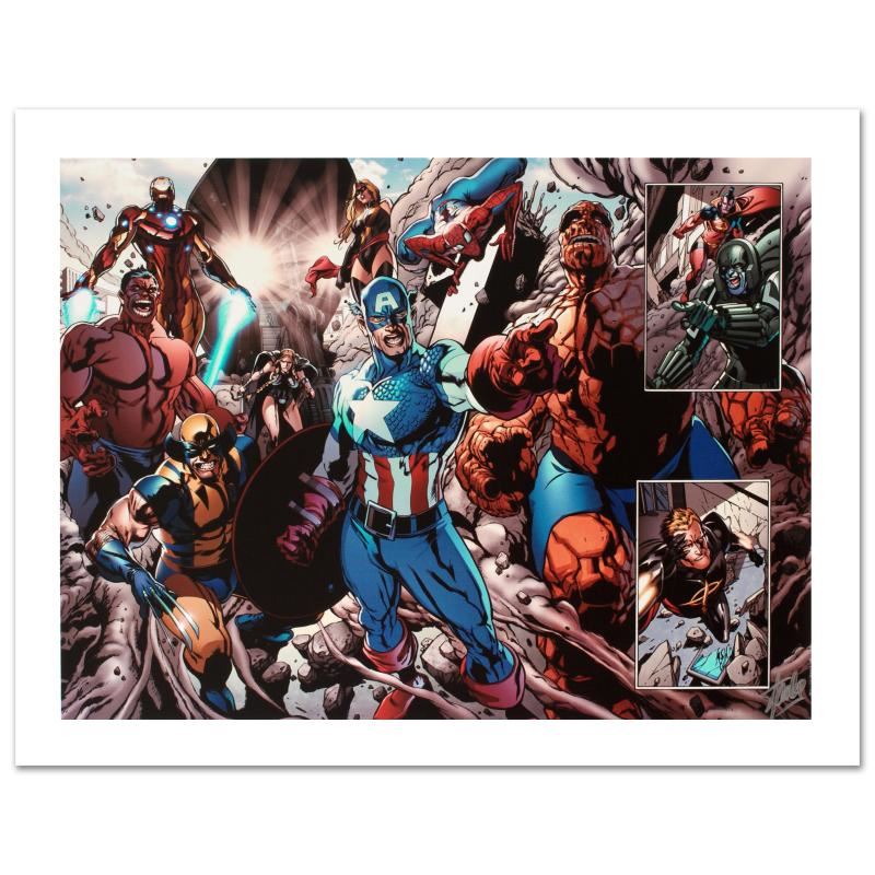 A piece of comic book history, this limited edition, from original art by Tan Eng Huat, depicts Iron Man, Red Hulk, Wolverine, Valkyrie, Ms.Marvel, Captain America, Thing, and Spider-Man. Named 'Best New Talent' in the National Comics Awards (NCA) 2002, Tan Eng Huat has been a featured artist for different comic companies such as Marvel. He is most recognized for his work on the Punisher, Ghost Rider, Annihilators, and Deadpool comics. "Earth Fall #2" is a limited edition giclee on canvas by Tan Eng Huat presented by Marvel Comics, numbered and hand signed by the great Stan Lee! Includes Certificate of Authenticity! Measures approx. 24" x 18" (image).