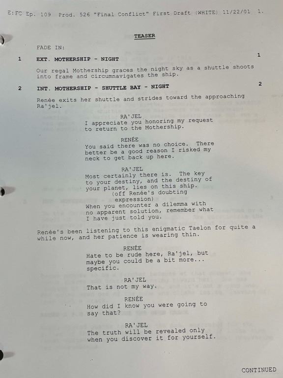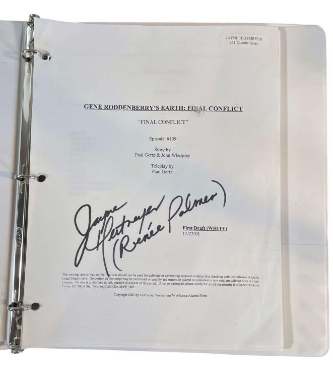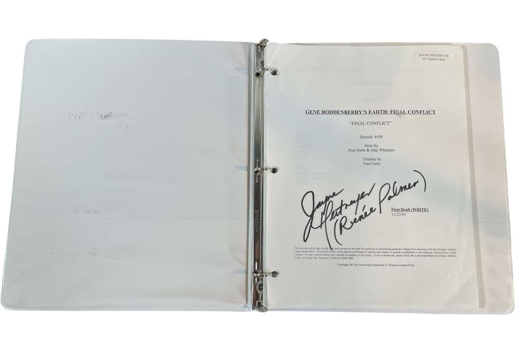 Original script signed by Jayne Heitmeyer, played by Renee Palmer on the Gene Roddenberry developed science fiction television series 'Earth: Final Conflict' (1997-2002), about an alien species that comes to Earth bearing gifts for humanity, a few suspicious humans seek to discover and resist the newcomers' true designs.