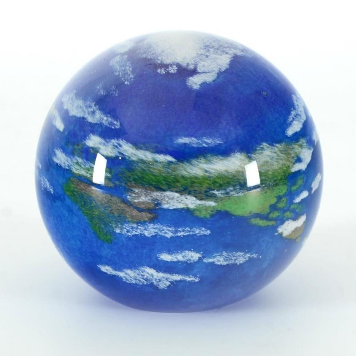 "Earth" is a hand blown glass paperweight (second) from Glass Eye Studios. This piece contains ash from the 1980 volcanic eruption of Mount St. Helens. As each piece is individually handcrafted, the pattern in the glass may vary slightly from the image shown. "Second" means very slightly imperfect, but still great quality. Measures approx. 3" x 3" x 3".