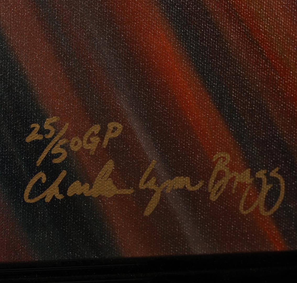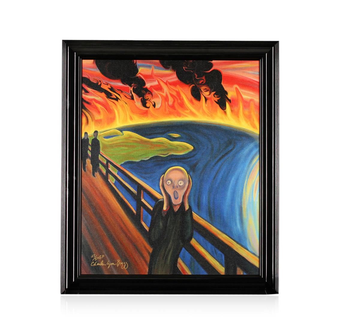 The Earth Icons series is a journey through Art History, with Charles Lynn Bragg utilizing the world's most famous paintings to remind us all that we must all remain aware that our planet is fragile and needs our loving care and our attention to its delicate balance. From his Earth Icons series , Bragg extracts the important elements that made Munch's "The Scream" an international sensation, and one of the highest selling paintings in art history . The artist he makes us see that the figure in the forefront is really screaming because the entire Earth is on fire. Interpret it literally or figuratively - either works -- and adds a new dimension to this famous image. Image size 24x20. It is frame in a simple black molding . Ship weight 11lbs.Limited Edition S/N Giclee on Canvas # 25/50