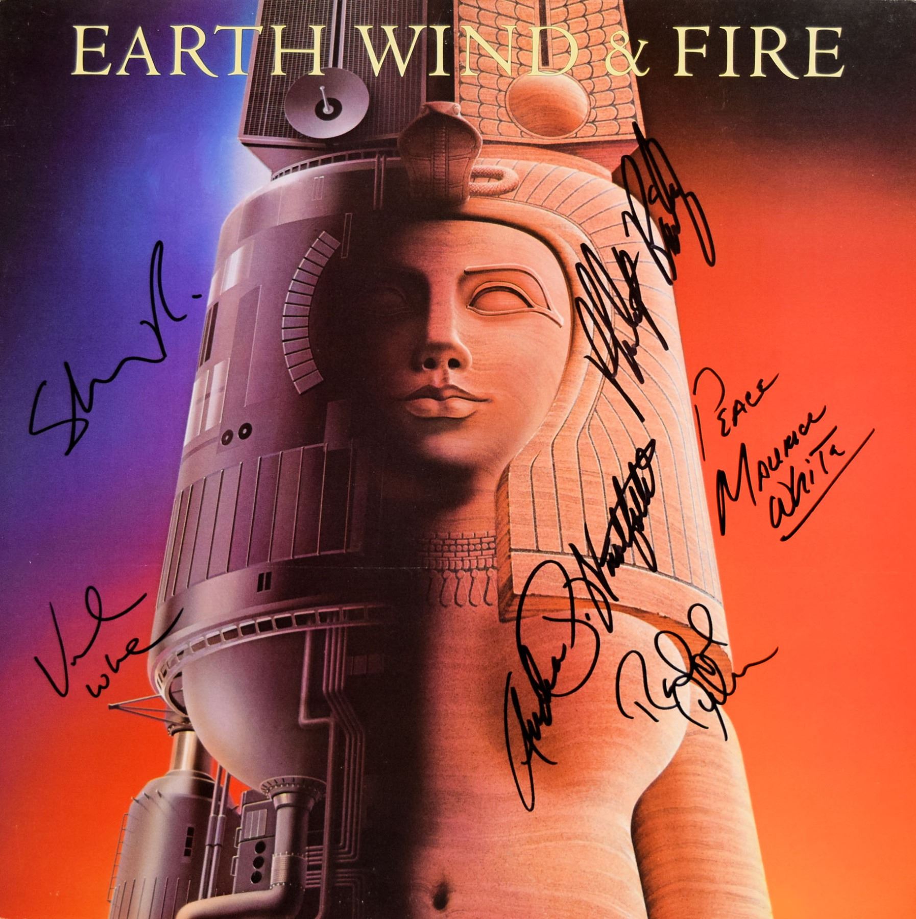 Earth, Wind & Fire Raised signed album autographed by Verdine White, Philip Bailey, Peace Maurice White, Andrew Wollforlk, Sheldon Reynolds & Ralph Johnson.