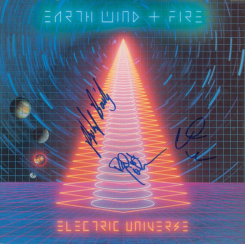Electric Universe album signed on the front cover in blue felt tip by Philip Bailey, Ralph Johnson, and Verdine White. In fine condition. The record is included.