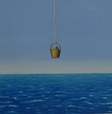 Oil on canvas. Signed illegibly lower right, dated 1990. Surrealist style. Approx. 39" H x 39" W. Property of a Bernardsville NJ collection (4069).