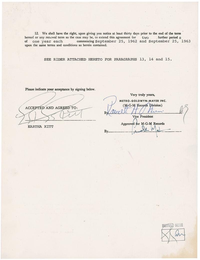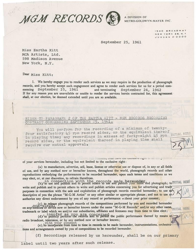 DS, six pages, 8.5 x 11, September 25, 1961. One year agreement between Kitt and MGM Records for Kitt to record a minimum of 24 45 rpm records with Kitt receiving a 5% royalty of the suggested retail price. Signed on the last page by Kitt and also initialed 22 times by Kitt. In very good condition, with scattered toning and soiling, multiple staple holes to top left corners, and a small rider stapled to first page.