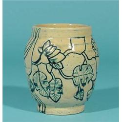 Earthenware pot, Abstract heads in green, maker's mark Ruman, numbered 883/14, h. 13 cm.