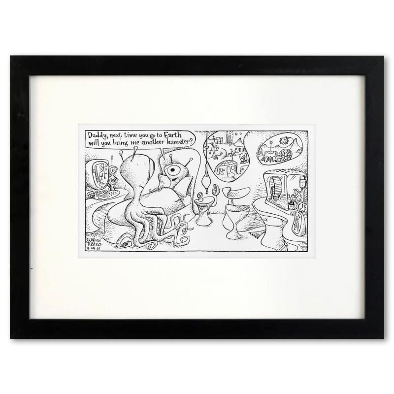 Enter a surreal and satirical world of twisted imagination and award winning creativity. "Earthling Hamster" is an original pen & ink drawing on paper by Dan Piraro, creator of the critically acclaimed and award winning comic strip, Bizarro. This piece is hand signed, comes custom framed and includes a letter of authenticity. Measures approximately 14" x 21" (frame), 7" x 13" (image).This item requires special handling and may have a longer than usual turnaround.