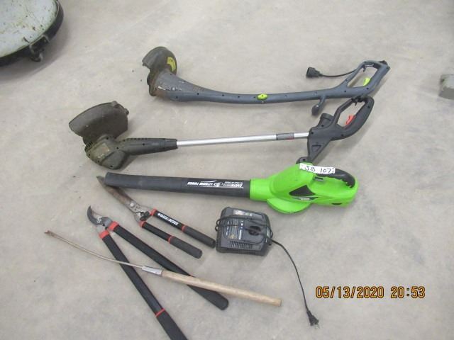 Earthwise Battery Blower, 2 Electric Weedeater, Hand Pruners, Hand Hedgers, Flower Bed Tools