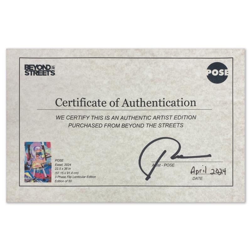 "Easel" is a limited edition 3 phase flip lenticular Artist Edition by POSE. This piece comes custom framed with a Certificate of Authenticity from Beyond the Streets that is hand signed by the artist. Measures approx. 40" x 26.5" (frame), 36" x 22.5" (image). This item requires special handling and may have a longer than usual turnaround.