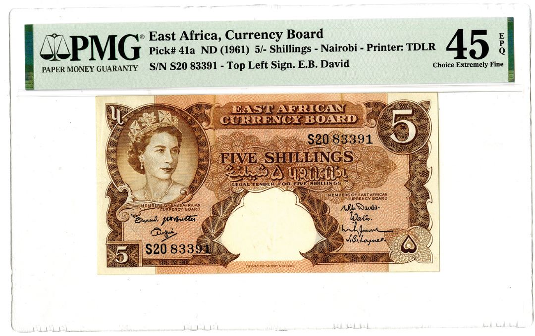 East Africa. ND (1961). 5/- Shillings - Nairobi, P-41a, Issued banknote, Brown, Queen Elizabeth II at left. S/N S20 83391 - Top Left Sign. E.B. David, PMG graded Choice Extremely Fine 45 EPQ. Printer: TDLR.