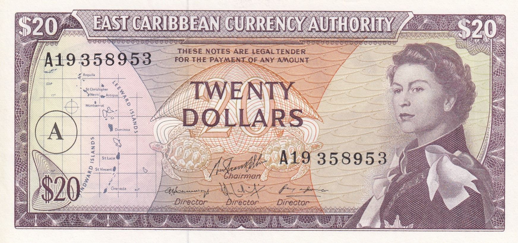 East Caribbean, 20 Dollars, 1965, UNC, p15hbr/Queen Elizabeth II portrait, serial number: A19 358953
