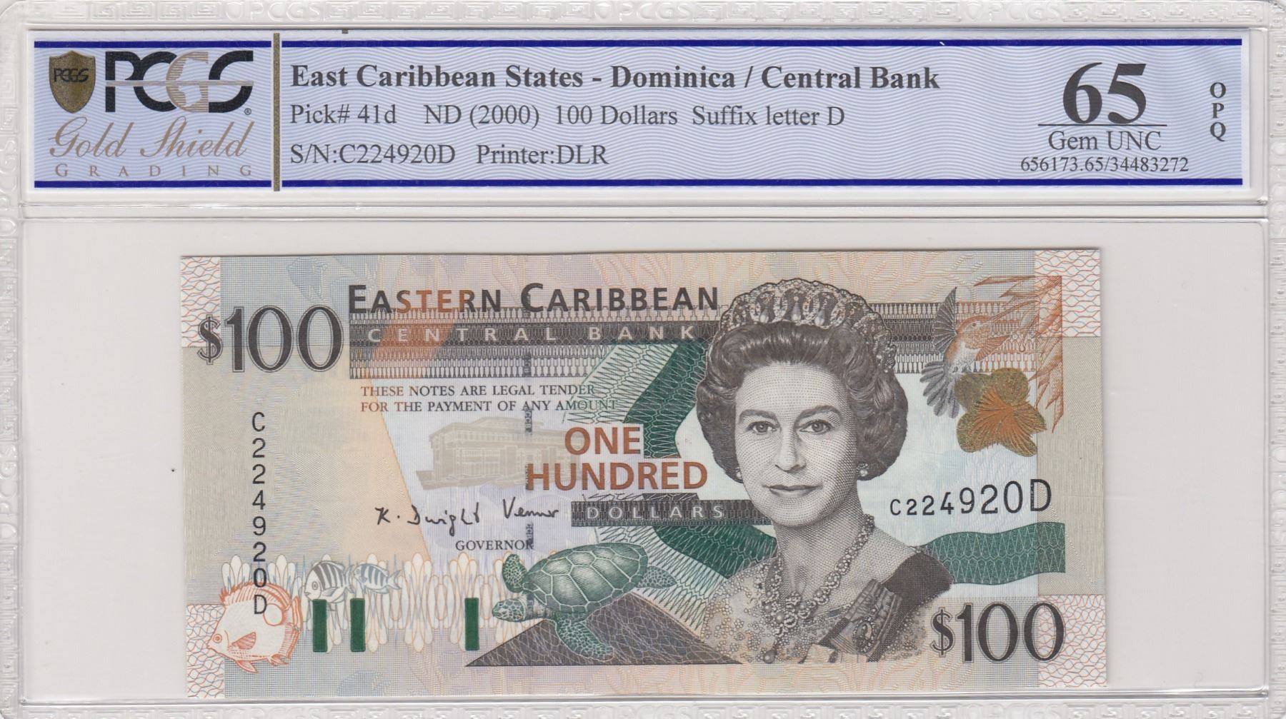 East Caribbean States, 100 Dollars, 2000, UNC, p41dbr/PCGS 65, OPQ, Queen Elizabeth II portrait, Dominica Islands, serial number: C 224920D