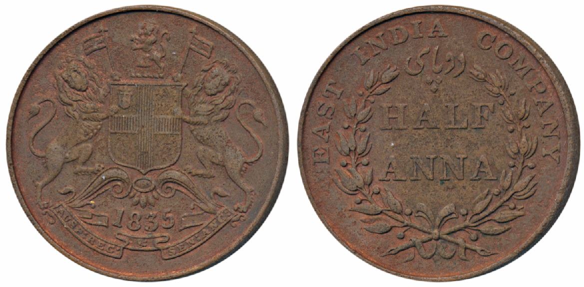 Copper ½ Anna, 1835, Bombay Mint, Shorter bar to digit ’5’ in date, (Prid 131). Very Fine+.