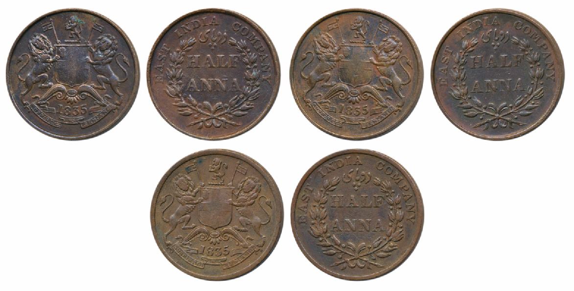 Copper ½ Anna, 1835, Madras Mint, A in India aligned, (Prid 133); A in India raised above; A in India dropped down, both Unlisted in Pridmore. Very Fine+.