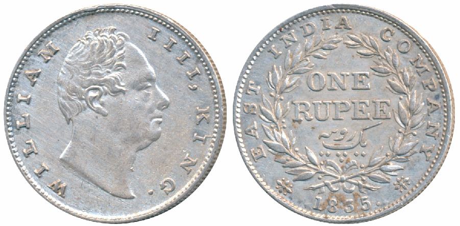 William IV, Silver Rupee, 1835, Calcutta Mint, RS incuse, B / II, Bud leaves, 20 Berries, (Prid 32). Extremely Fine, two edge nicks at top.