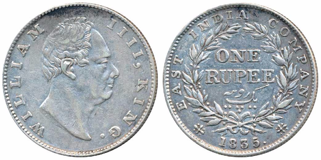 William IV, Silver Rupee, 1835, Calcutta Mint, Mule, F incuse, No dot after F, A / II, Bud Leaves, 20 Berries, obv. die of Forbes (F) paired with an old rev die of Robert Saunders (RS), Robert Saunders (Jan1826-Jan1836) and William Narain Forbes (Jan1836-May1855) both were Mint masters of Calcutta Mint, Unlisted in Pridmore (GK 12). Very Fine+, Very Rare.