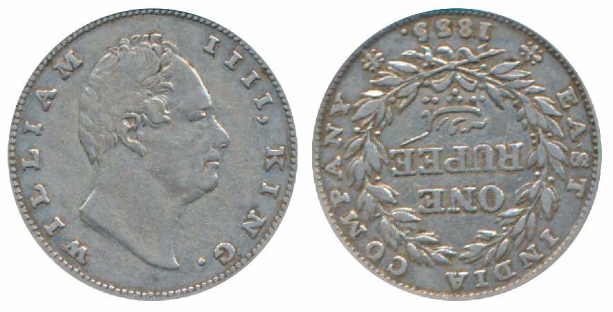 William IV, Silver Rupee, 1835, Bombay Mint, No initials, B / II, Bud leaves, 20 Berries, Inverted die axis (rev. die rotated to 6 o’clock), Unlisted in Pridmore. Very Fine+, Rare.