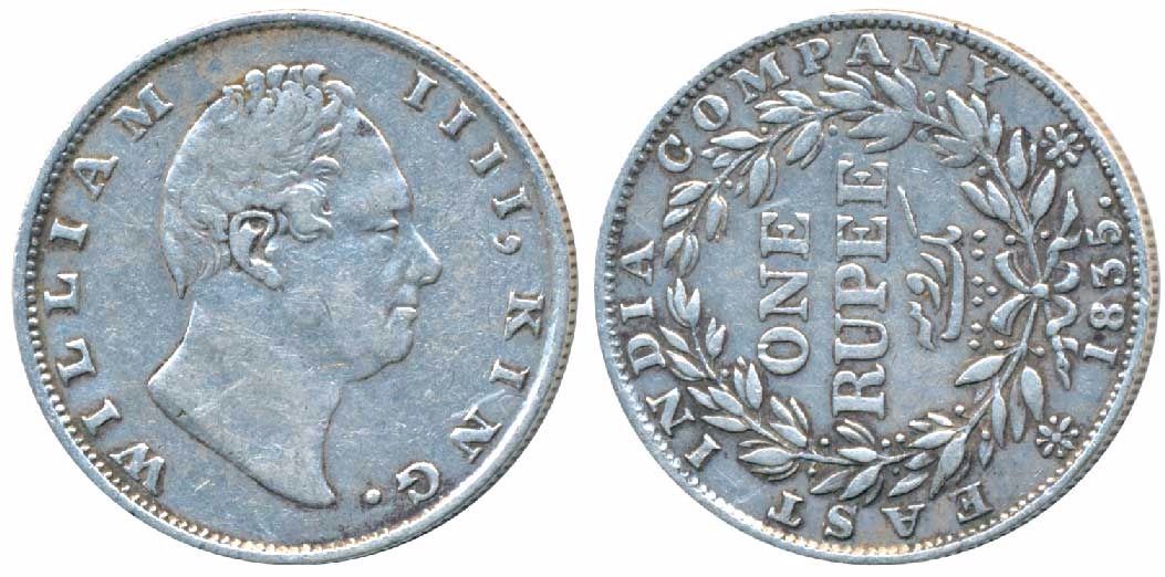 William IV, Silver Rupee, 1835, Calcutta Mint, Dug out F incuse, A / III, Bud leaves, 19 Berries, rotated Die Axis, rev. die erroneously aligned to 9 o’clock, Unlisted in Pridmore. Very Fine, Very Rare.