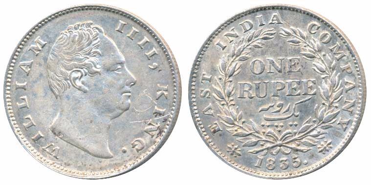 William IV, Silver Rupee, 1835, Calcutta Mint, F incuse, A / I, Two Leaves, 19 Berries, (Prid 36). About Extremely Fine.