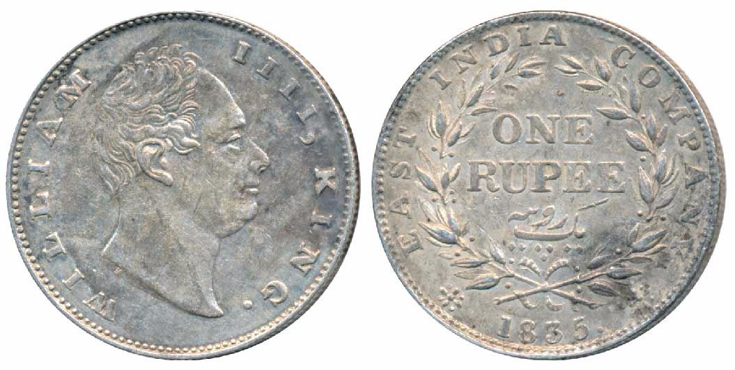 William IV, Silver Rupee, 1835, Calcutta Mint, F incuse, No dot after F, A / II with 2 leaves on both sides of wreath (above O & E of ONE), wreath tips spaced apart compared to regular Rev II, 19 Berries, this reverse is unlisted in any reference catalogues. Extremely Fine, Very Rare.