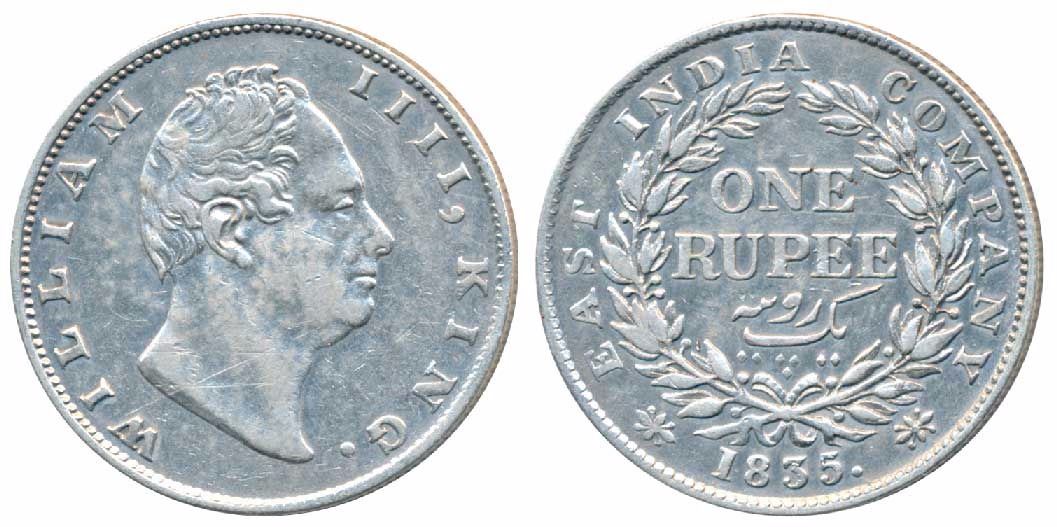 William IV, Silver Rupee, 1835, Calcutta Mint, Dug out F incuse, A / I, two leaves, 19 Berries, Unlisted in Pridmore (GK 18). Very Fine+, Extremely Rare.