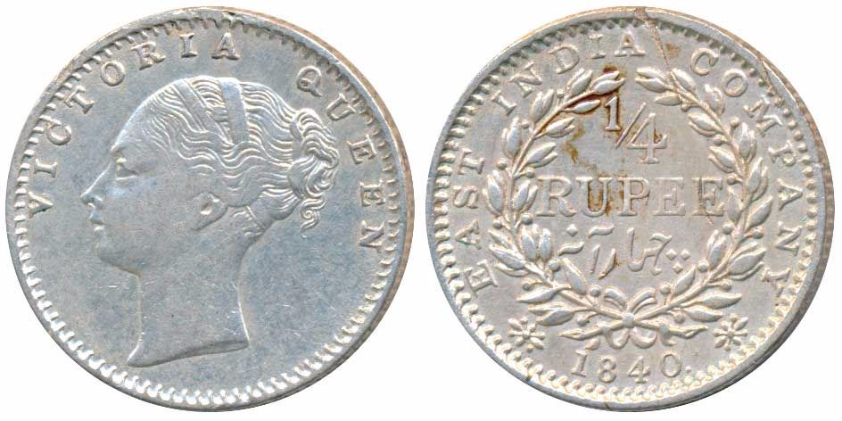 Victoria Queen, Silver ¼ Rupee, 1840, continuous legend, Calcutta Mint, Mule, Indian head, incused diagonal line on 2nd ribbon, curl of hair on cheek, hair curl behind neck ends in double strand, longer teeth design around rim, 20 Berries (10L+10R), rev. die of English Head is paired with an Indian Head obv. die, (Prid 103). Very Fine, Very Rare.