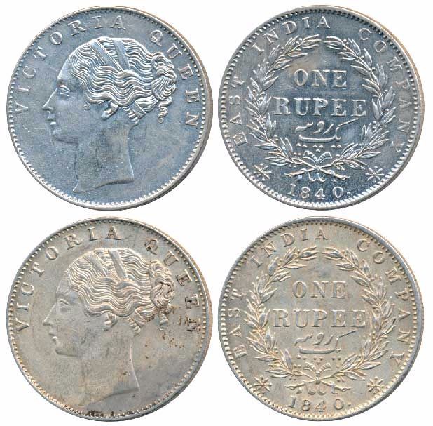 Victoria Queen, Silver Rupee, 1840 (2), continuous legend, Calcutta Mint, Indian Head, 35 Berries, crescent in relief, without M incuse, (Prid 53). Extremely Fine and About Extremely Fine, Rare. (2)