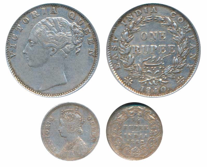 Victoria Queen, Silver Rupee, 1840, Continuous legend, Bombay Mint, English Head with Modified Features, 35 Berries, (Prid 52); & Silver ¼ Rupee, 1862, Madras Mint, A / I / No mint mark, inverted numeral 1 replaces first āIā in VICTORIA, (Prid 378-A). Very Fine+. (2)