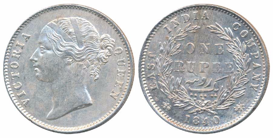 Victoria Queen, Silver Rupee, 1840, Divided legend, Calcutta / Bombay Mint, WW raised, 28 Berries, (Prid 57). About Uncirculated.