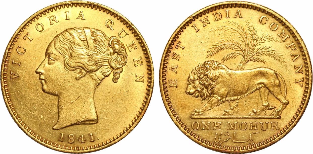 Victoria Queen, Gold Mohur, 11.65g, 1841, “No initial”, Continuous legend, Obv: Bust facing to left, English legend & date “VICTORIA QUEEN 1841”, Rev: A Lion facing to left in front of a Palm tree, English legend “EAST INDIA COMPANY, ONE MOHUR” & In Persian “EK ASHARFI” (Prid# 18). Very fine to very fine+, very rare.