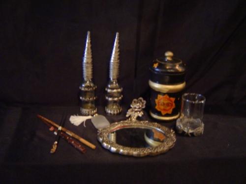6" Painted Sun/Moon Box, two 8" perfume oil bottles with ornate metal caps, three asst. hair sticks, one2" perfume vial w/ tassle, one pewter sun/moon votive holder w/ glass votive cup, and one decorative silver tone wall mirror