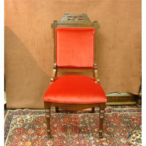 East Lake Victorian Walnut Sidechair. Newly upholstered with beautiful red velour fabric.