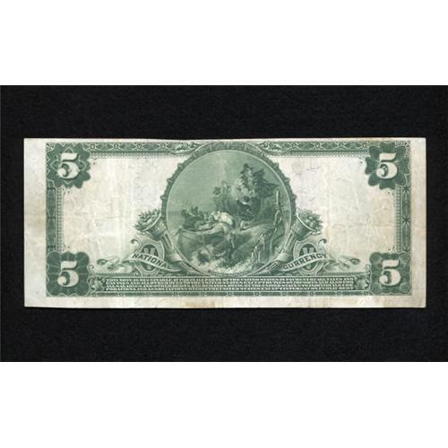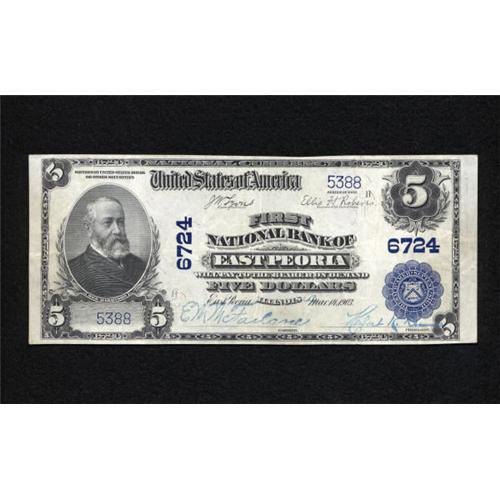 <B>East Peoria, IL</B></I> - $5 1902 Plain Back Fr. 598 <B>First NB</B></I> Ch. # 6724<B></B></I><BR> Beautiful blue stamped signatures of E.M. McFarlane and Herbert R. Dennis decorate this handsome, evenly circulated note from a tough bank. The First would close its doors for the last time in September 1934, leaving just $335 in large notes outstanding. <B>Very Fine,</B></I> with original surfaces.<BR><BR><b>Shipping:</b> Coins & Currency (<a target="_blank" href="http://www.heritageauctions.com/common/shipping.php">view shipping information</a>)